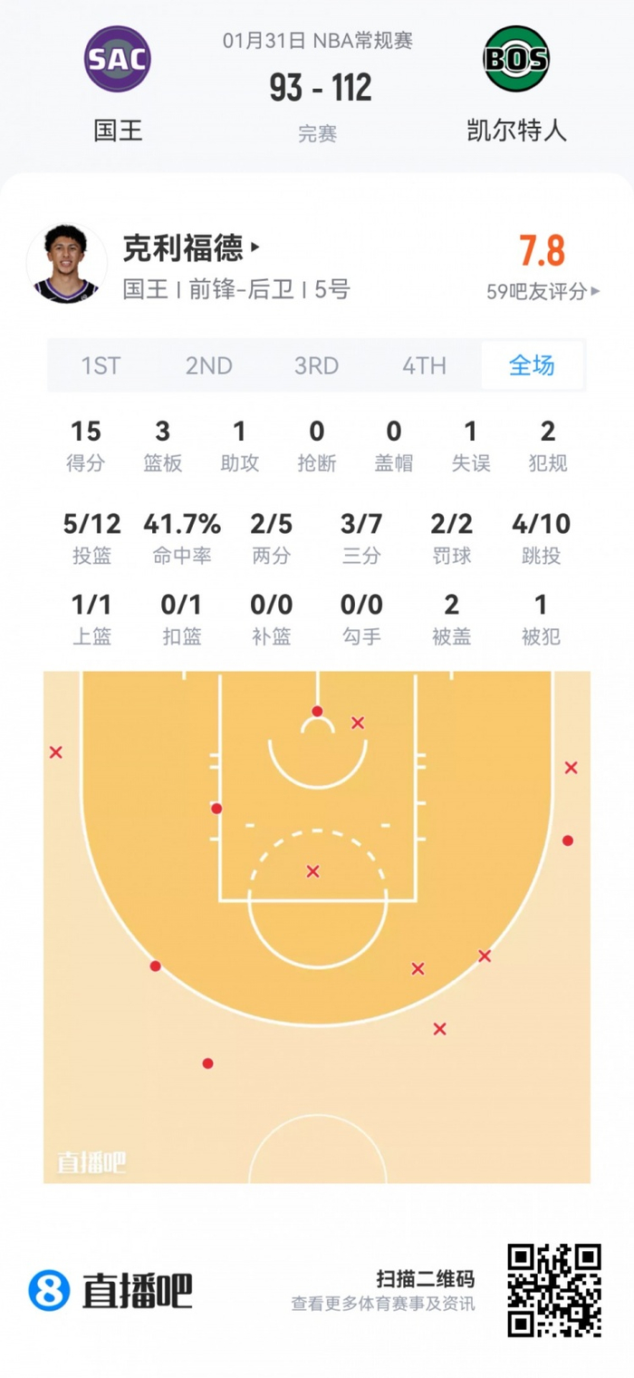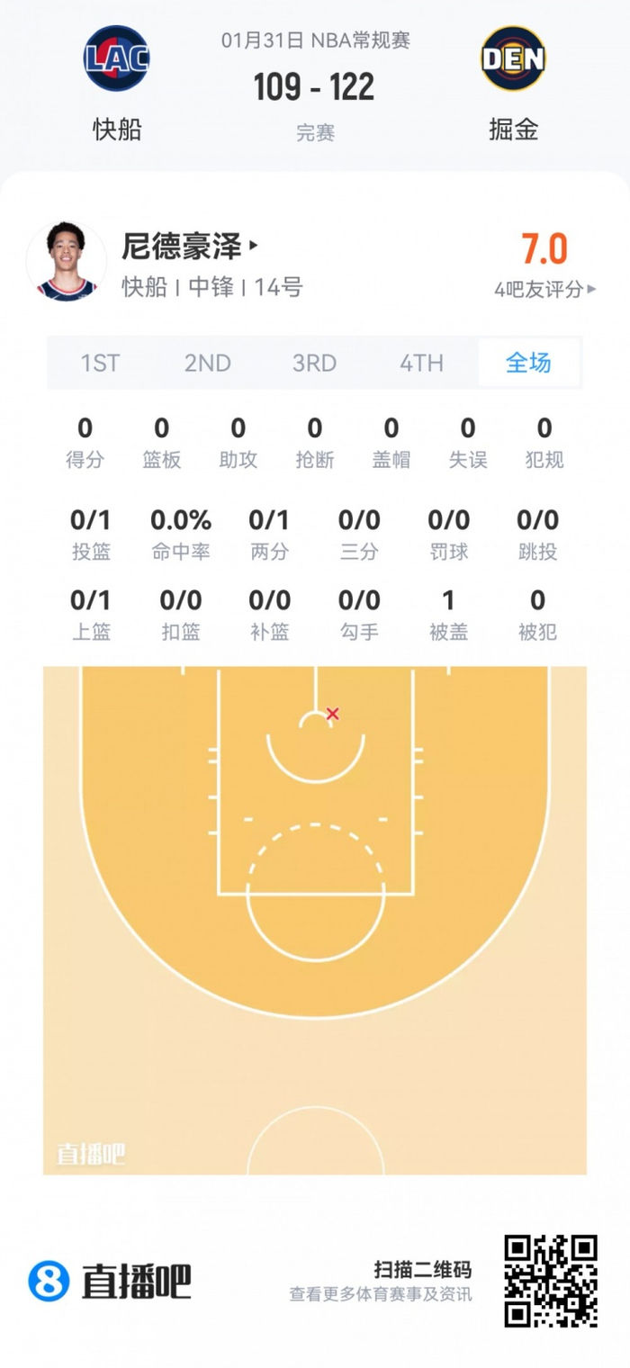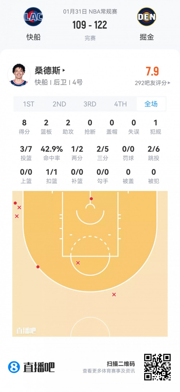 快船次轮50号秀科比·桑德斯 登场22.5分钟