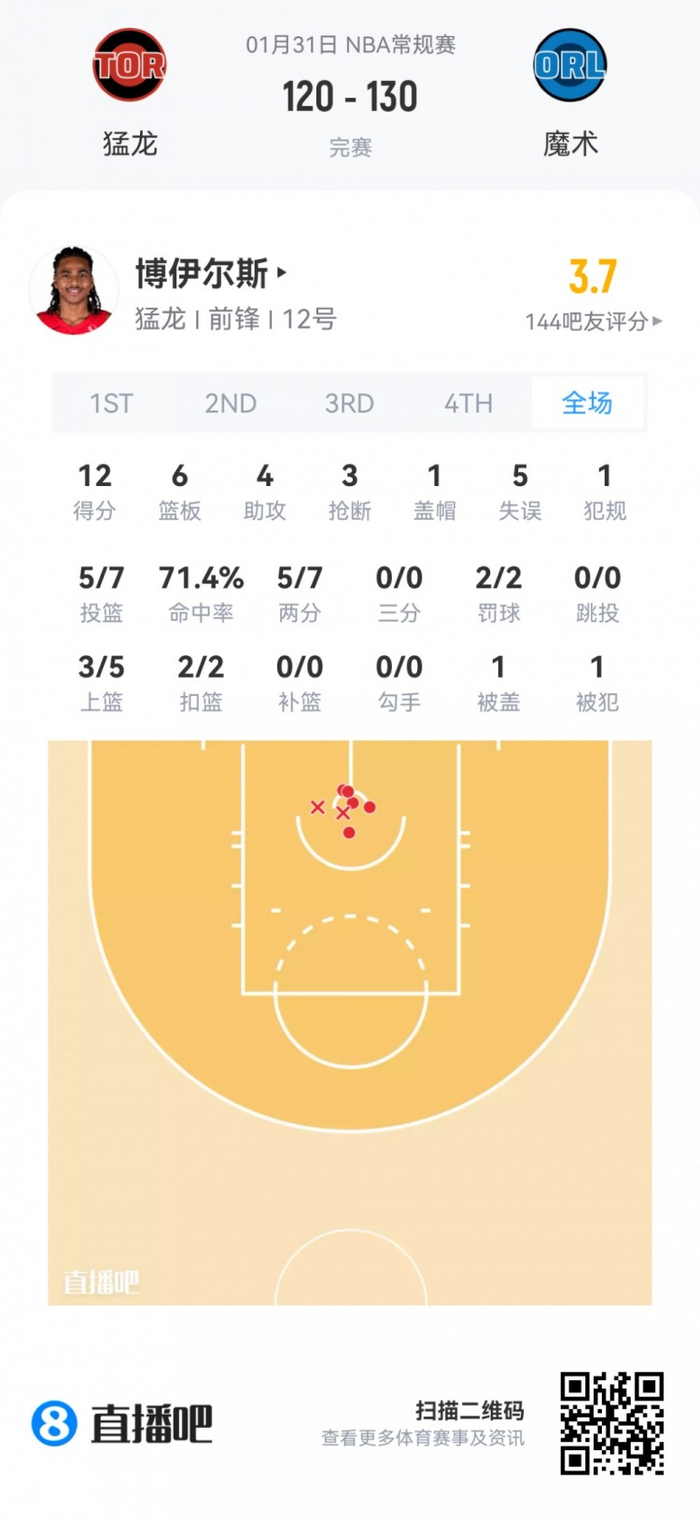 猛龙首轮9号秀博伊尔斯 登场33.3分钟