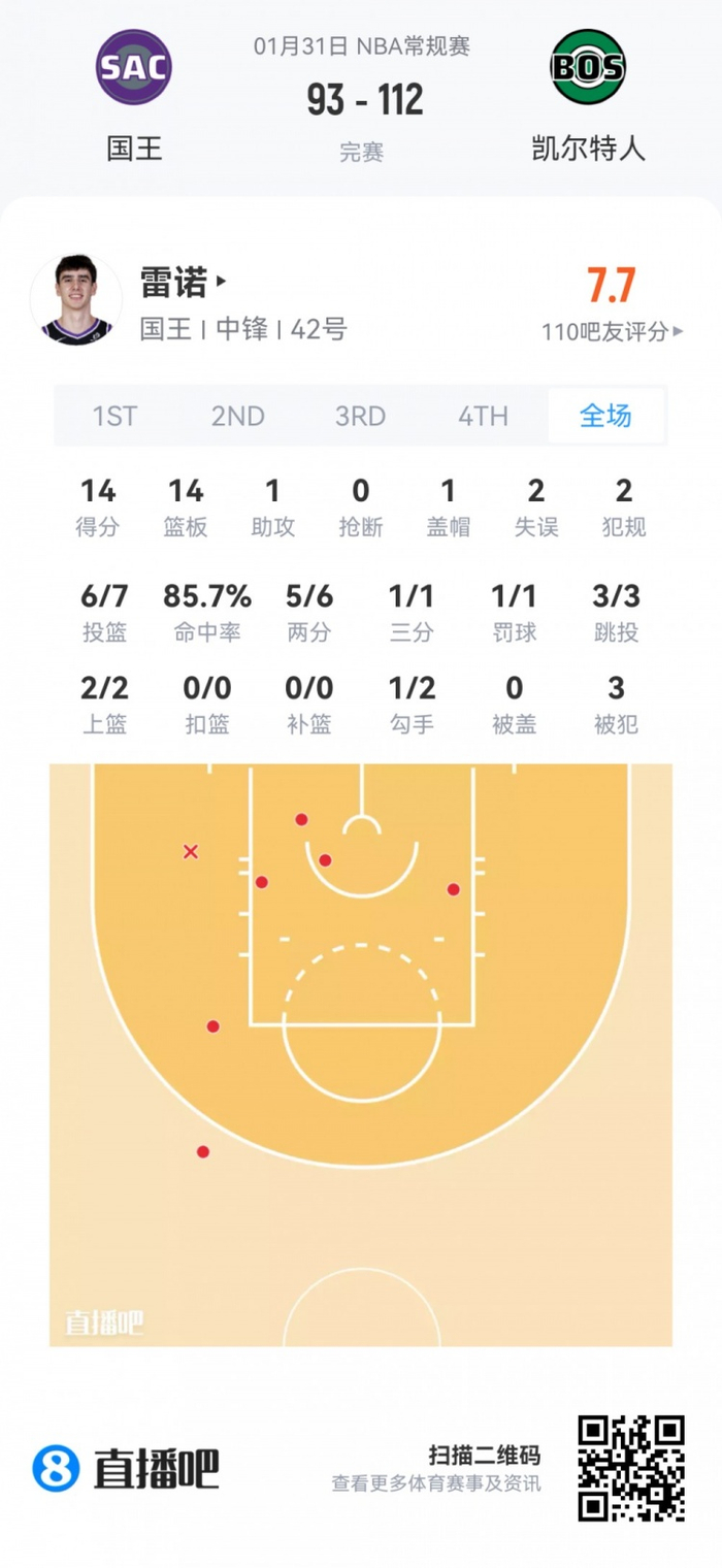 国王次轮42号秀马克西姆·雷诺 登场36.1分钟