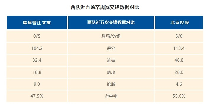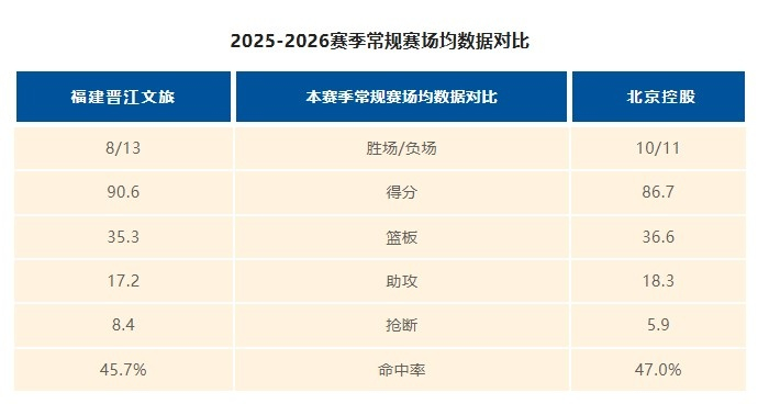 2025-2026CBA第二十二轮福建晋江文旅男篮坐镇主场迎战北京控股男篮,本赛季两队数据各有优劣,主队场均得分90.6分略高于北控的86.7分,场均8.4次抢断更是联赛上游水准,反击端冲击力十足;北控男篮则在团队串联和内线护框上稍占优势,场均18.4次助攻和3.4次盖帽,展现出内线轮换深度和团队篮球的特点。