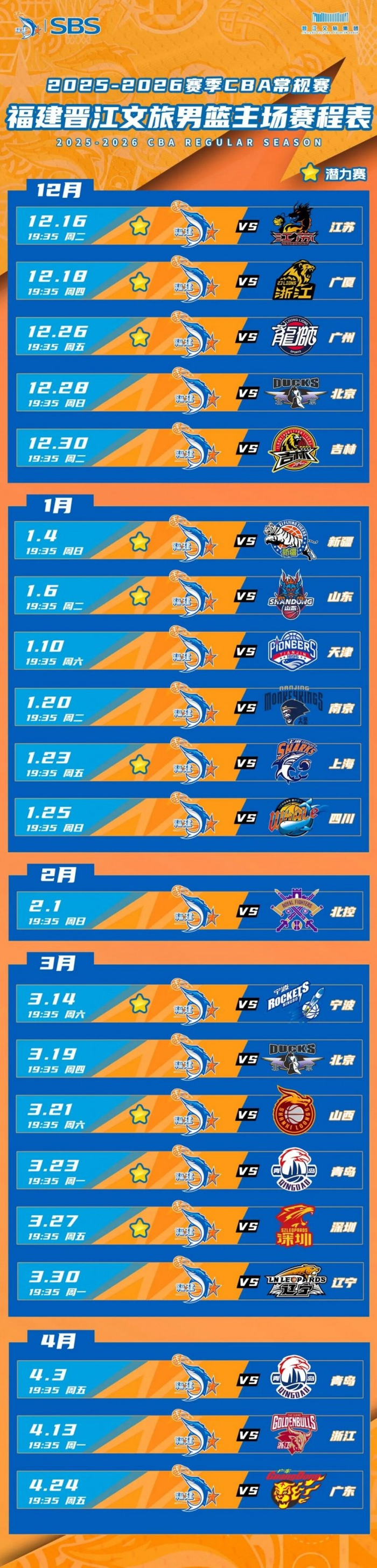 2025-2026赛季CBA常规赛第二十二轮明晚鸣锣打响,福建晋江文旅男篮迎来蛇年主场收官之战,明晚(2月1日)19:35再战北京控股男篮。