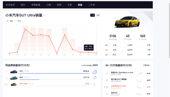 据懂车帝等平台数据,2025年12月小米SU7 Ultra销量为45辆。