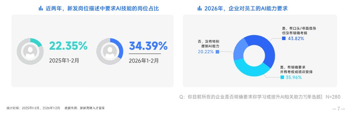 与此同时,企业对员工的AI能力要求正在从“加分项”转变为“硬指标”。34.39%的新发岗位描述中明确提及对AI或大模型相关技能的要求,较去年同期的22.35%大幅提升。调研中,近八成被调研者表示所在公司已提出AI能力相关要求,超三成已配套考核或培训机制。