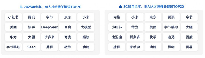 同时,AI⼈才的搜索更偏向技术与AI相关领域,如DeepSeek、大模型、微软、夸克、Seed、蚂蚁等。非AI人才的搜索则更偏向传统头部大厂与求职渠道本身,“内推”一词位列其热搜榜首,同时他们对比亚迪、大疆、米哈游、得物、网易、追觅等各个赛道的头部企业关注度更高。