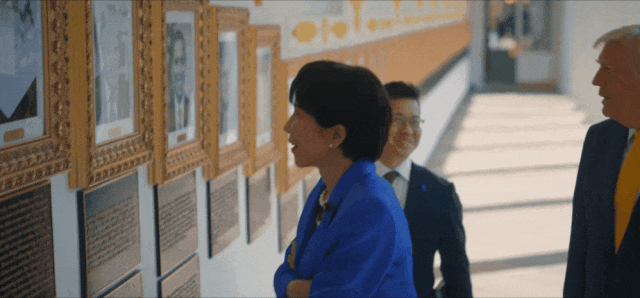 反正,视频显示,经过白宫“总统星光大道”走廊时,一看到特朗普的照片,高市两眼放光,伸出双臂,张大嘴巴。