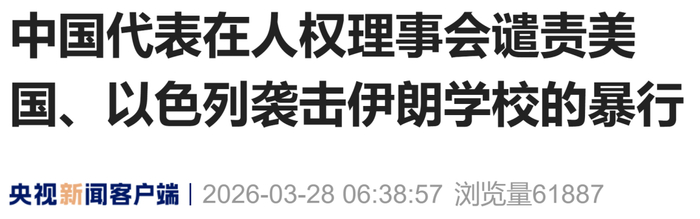 中国代表在人权理事会谴责美国、以色列袭击伊朗学校的暴行