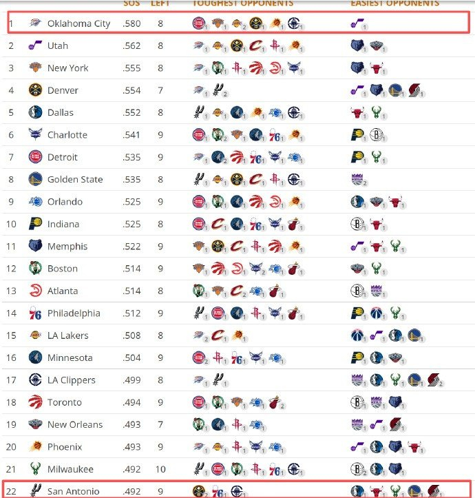 目前雷霆领先2.5场,由于和马刺交手是劣势,所以他们后面只能比马刺多输1场。雷霆剩余赛程难度联盟第一,要打多个季后赛球队(也要看到时候对手会不会轮休或者挑对手),而马刺剩余对手平均胜率低很多。”