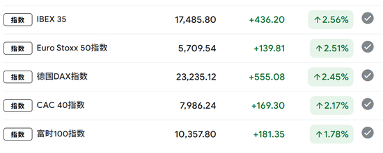 与此同时,A股收盘之后,欧洲股市也在暴涨!德国、法国、英国涨幅均在2%左右。