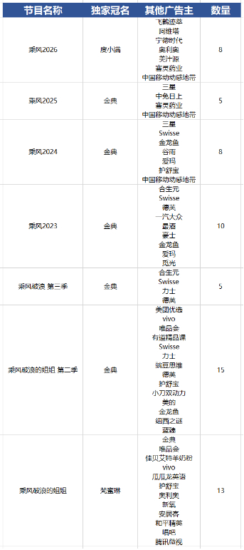 回顾《乘风》系列从第一季到2026年的商业化历程,可以清晰地看到几个重要变化。首先是广告主数量的起伏:第一季为13家,第二季达到历史峰值的15家,第三季骤降至5家,第四季回升至10家,第五季为8家,2025年再次触底至5家,2026年则回升至8家,整体呈现出一条高位开局、冲高回落、低位震荡、缓慢恢复的曲线。