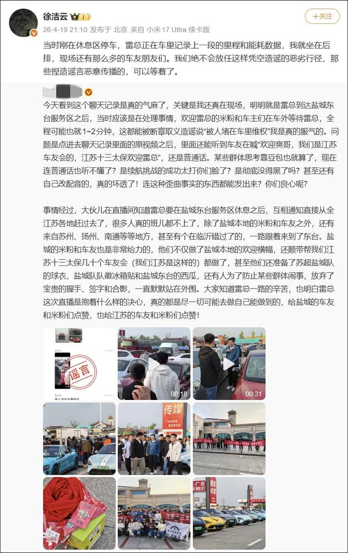 此前报道,4月19日,小米集团董事长特别助理、战略市场部副总经理徐洁云回应网传“雷军被堵车里维权”:“当时刚在休息区停车,雷总正在车里记录上一段的里程和能耗数据,我就坐在后排,现场还有那么多的车友朋友们。我们绝不会放任这样凭空造谣的恶劣行径,那些捏造谣言恶意传播的,可以等着了。”